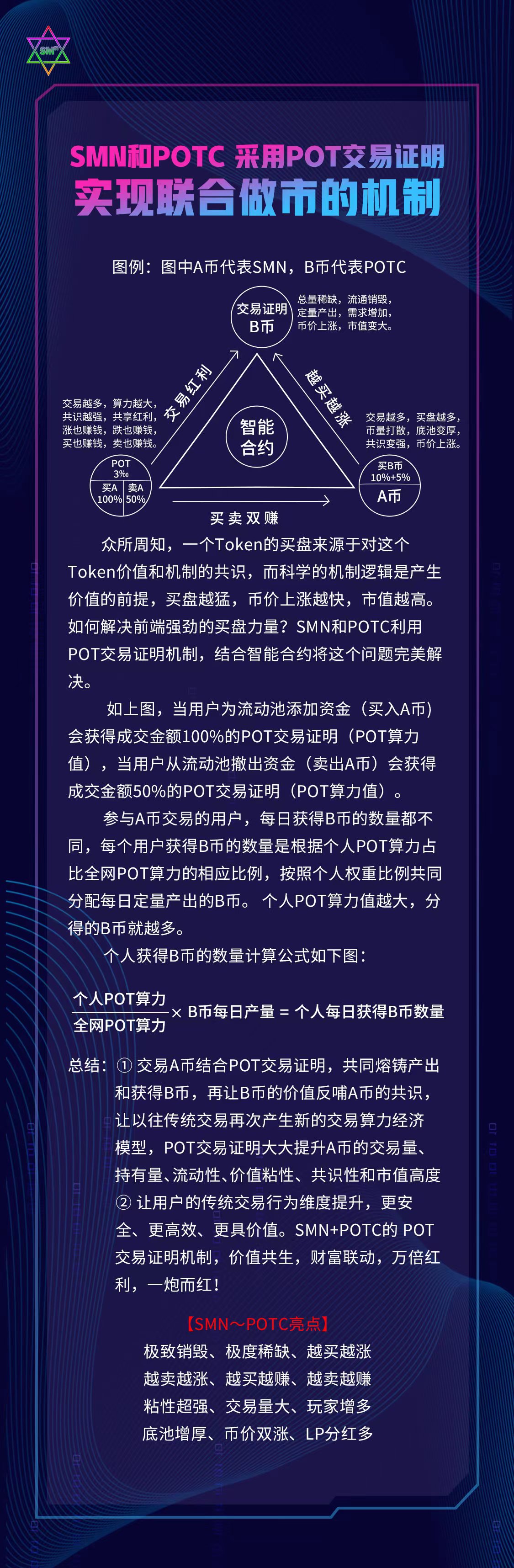 SMN公链团队通过研究人类心理和交易博弈论,包括交易经济学,得出一套科学完整的全新资产交易赋能机制,Proof of transancion,简称POT交易证明。POT交易证明是通过交易证明的记账方式,把交易量记录下来,作为一种贡献值,也叫POT算力值,再根据这种算力值的权重,给所有参与资产交易的对象,每日奖励另外一个全新的Token,作为鼓励对资产进行交易的激励。如此可以更加高效实现资产交易热度,调动更多的用户参与资产交易的主动性和积极性。