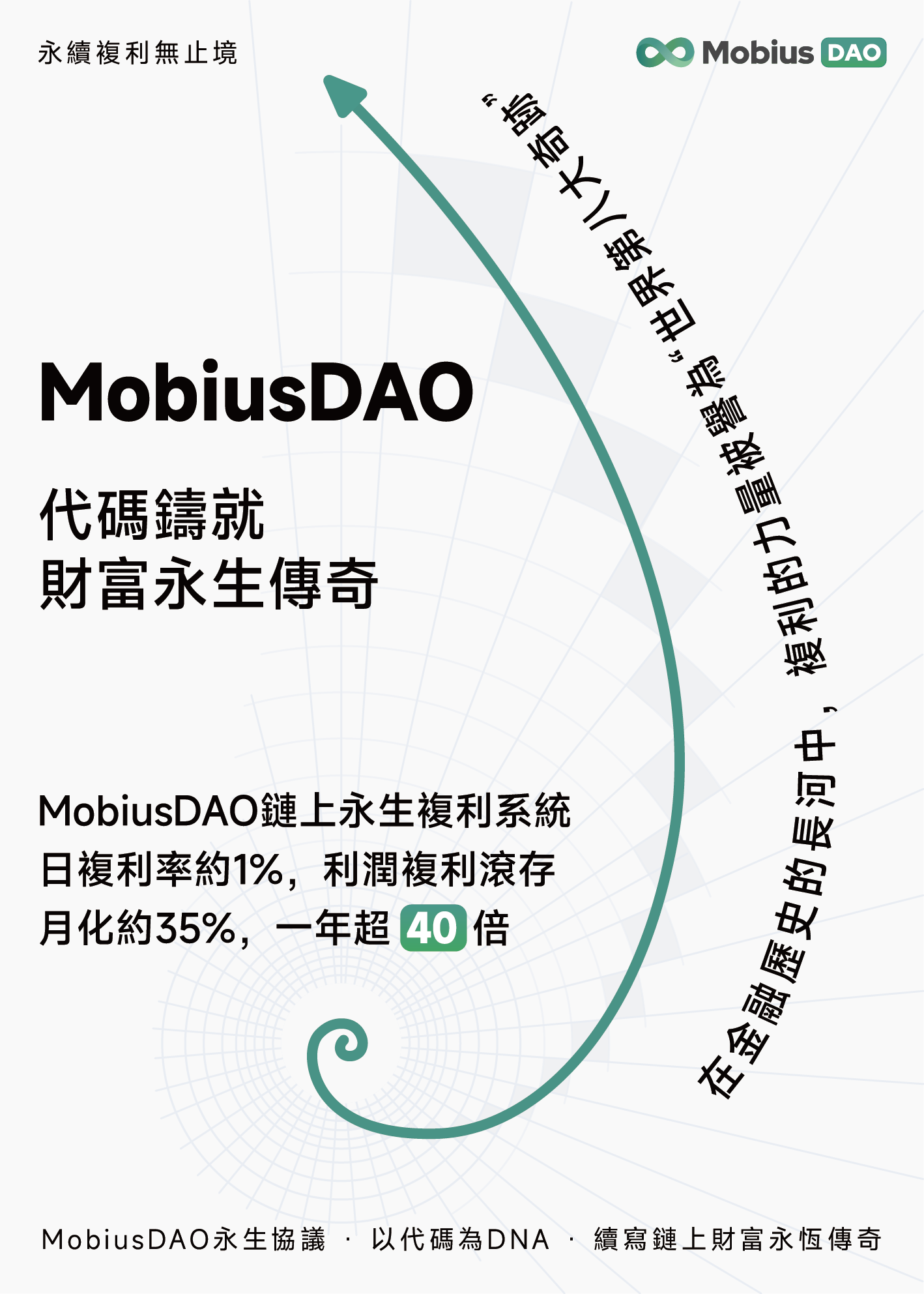 MobiusDAO的核心在于其“永生协议”: 一个永不关网、价值永存、代币永续增值的去中心化金融体系。何谓永生?它意味着项目依托区块链技术的不可篡改性与精密设计的经济模型,构建了一个自我调节、可持续运行的生态闭环,其生命力如同莫比乌斯环般生生不息。